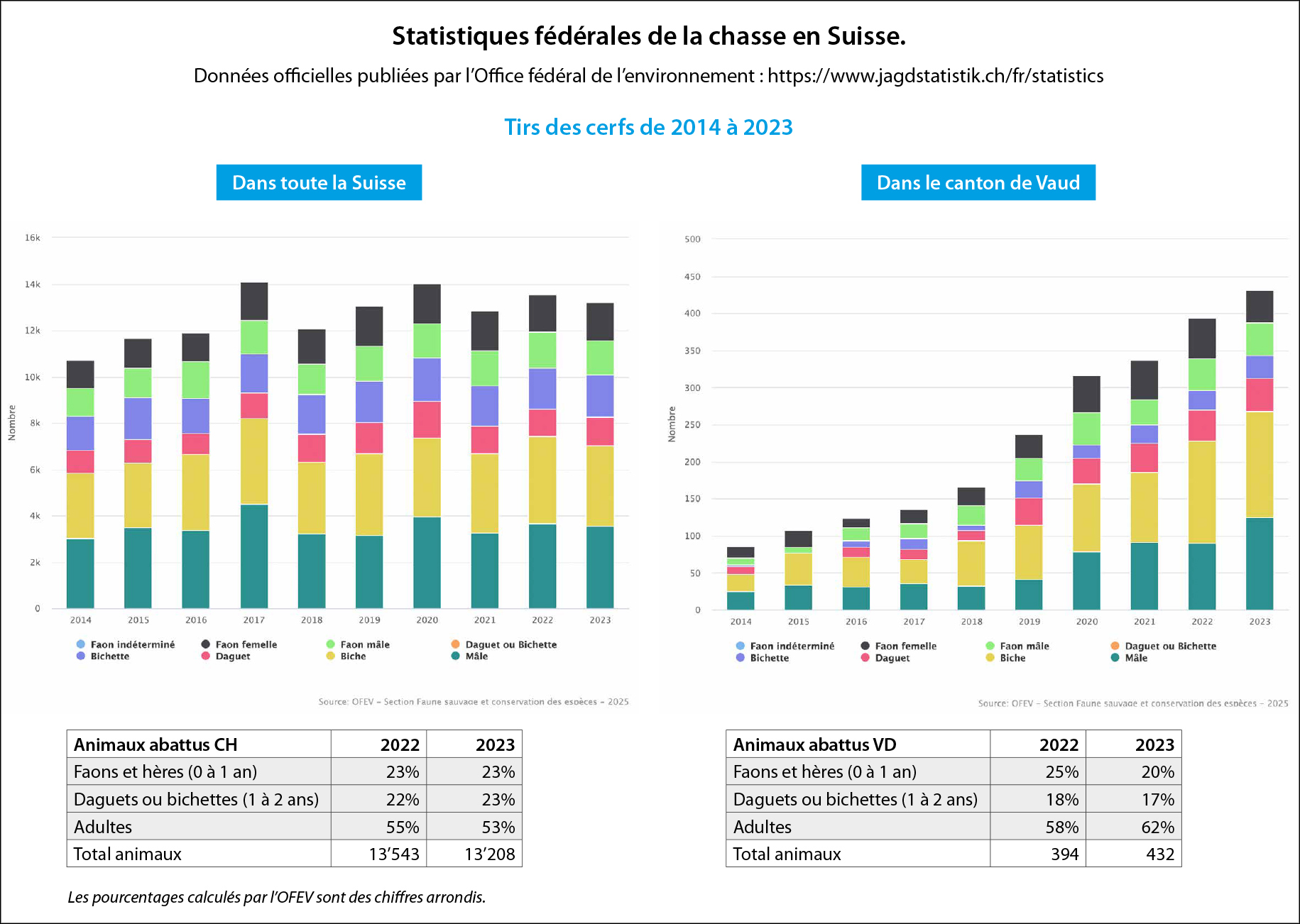Pour justifier l’abattage de 50 % de jeunes de moins d’un an, l’OCAN explique qu’il essaie «de travailler avec un esprit de protection de la nature (…) Avec la présence du loup, c’est environ 50 % des 0-6 mois et 20 % des 6-1,5 an qui vont être prédatés (…) Pour nous, il est éthiquement totalement inadéquat de s’éloigner des dynamiques naturelles et de la pyramide des âges naturelle». Aussi louable que paraisse ce raisonnement, il va à l’encontre de la pratique de tous les autres cantons, qui ne tirent qu’environ 25 % de jeunes. L’OCAN justifie les tirs de cerfs pour «contribuer à l’effort de régulation de cette espèce au niveau régional», mais fait le choix d’abattre des animaux qui échapperaient au fusil ailleurs.