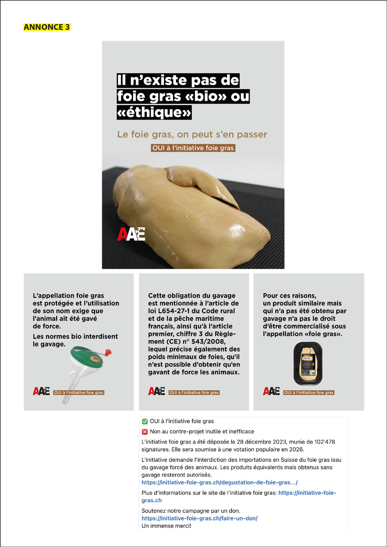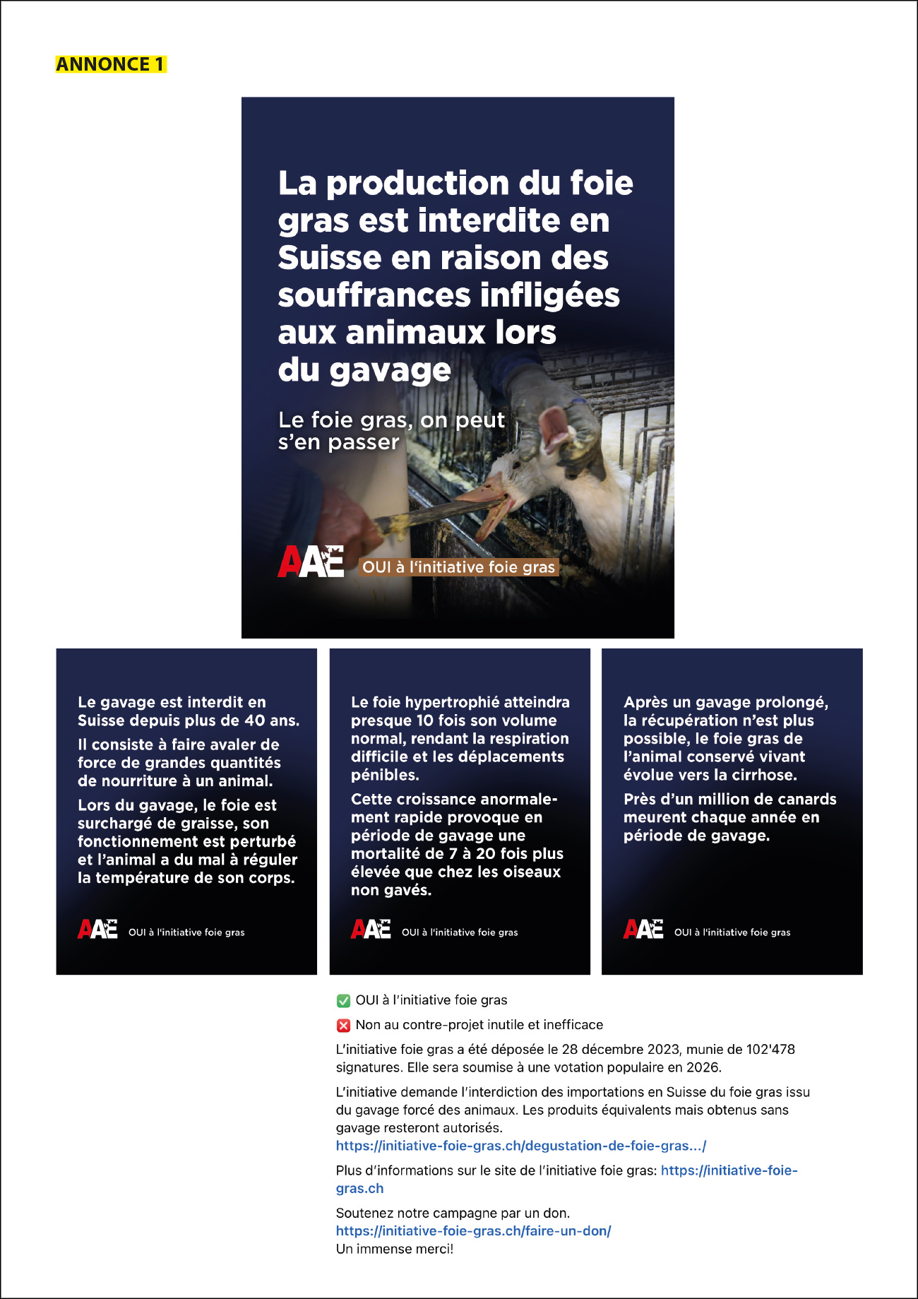 Avec le slogan «Le foie gras, on peut s’en passer», les annonces abordent quatre thèmes liés au foie gras: le gavage forcé des animaux, son interdiction en Suisse depuis plus de 40 ans, l’inexistence d’un foie gras «éthique» ou «bio», ainsi que l’image idéalisée du «petit producteur artisanal», censé produire un foie gras sans souffrance animale.
